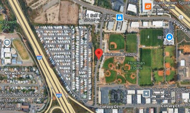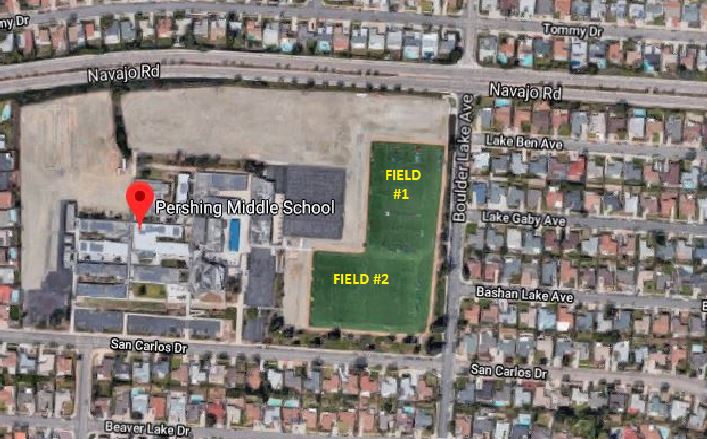 I-805 to Clairemont Mesa Blvd, travel East. Turn left on Shawline (1st light). At the stop sign turn Left on Convoy Ct. Next stop sign Turn right on Hickman Dr. Hickman fields are located about 100 yards on your right hand side. Turn Into the Complex and follow the dirt road to the soccer fields (straight ahead passed the Baseball fields) Teams playing on Fields 1 & 2 can park on Copley Drive. From Hickman Drive proceed to Stop Light (do not enter Hickman field dirt road) Turn right on Copley.